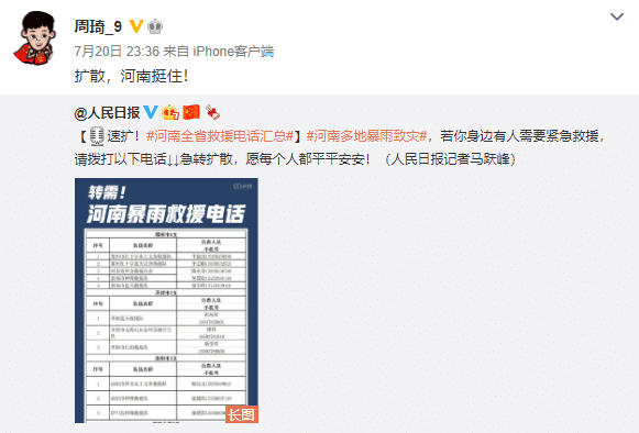 新疆男篮球星周琦转发河南暴雨救援电话,并且发微博写道:扩展,河南挺住!