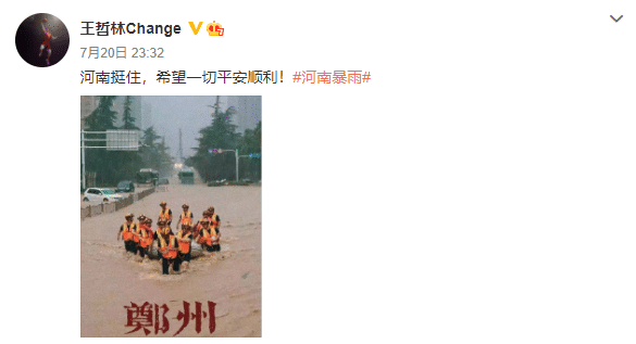 上海队球员王哲林晒救援图,并写道:河南挺住,希望一切平安顺利!
