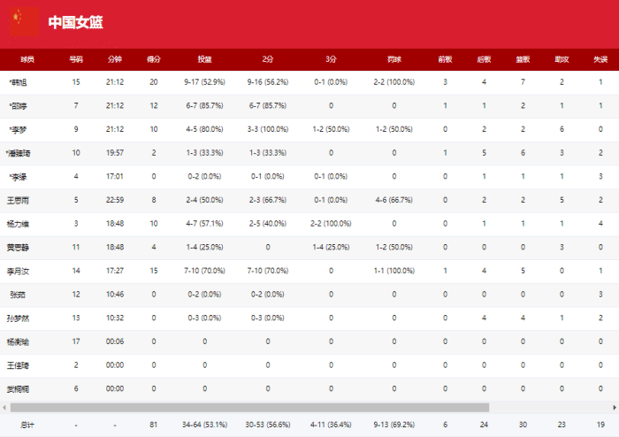 中国女篮:韩旭20分7篮板2助攻,邵婷12分,李梦10分6助攻,王思雨8分5助攻,黄思静3分,杨力维10分,李月汝15分5篮板;
