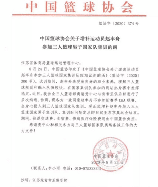 赵率舟的遗憾和不满是可以理解的,毕竟作为此前江苏男篮主力前锋的他在26岁的时候放弃了一年CBA联赛,结果却无缘参加东京奥运会,是非常可惜的。去年8月中国篮协印发邀请函,表示赵率舟在三人篮球国家队试训期间,理解规则和融入队伍较快,在国家集训队参加的两站热身赛中发挥稳定,各方一致同意赵率舟不参加新赛季CBA联赛,全身心投入到三人篮球国家队集训。
