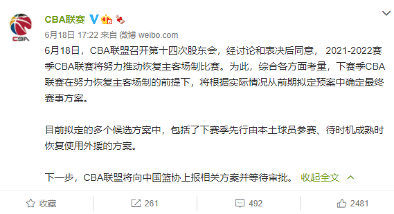 来源:直播车06-19 11:52直播车讯 近日CBA公布了第十四次股东会的相关议题,其中就包括了下个赛季恢复主客场制,先由全华班参赛,待时机成熟时恢复使用外援的方案。现在看起来上报的这个方案是很有可能通过的,如果是这样,那么也就意味着下个赛季的CBA联赛,初期是没有外援的,而根据各方的报道显示,如果方案通过,那么全华班预计会打到2月份,全华班至少要在大型国际赛事闭幕前一直执行,也就是到明年2月20日。