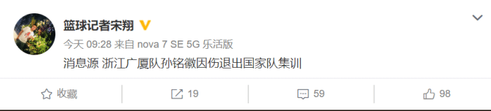 来源:直播车06-12 21:03直播车讯北京时间6月12日,中国男篮集训队传来新消息,记者宋翔爆料孙铭徽已经离开国家队,另据媒体人“导演我躺哪CBA”爆料,高诗岩、于德豪也已退出国家集训队。