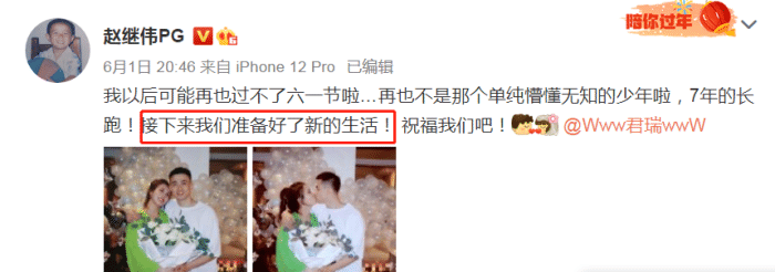 赵继伟在社媒宣布求婚成功。他直言以后再也过不了儿童节了,再也不是那个懵懂无知的小年,7年恋爱长跑,接下来他和女友将准备好新的生活。