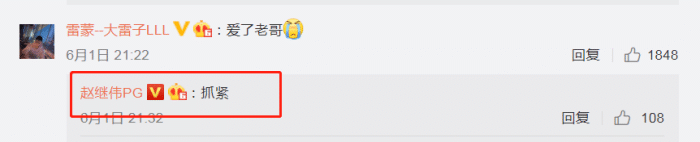 雷蒙也发了哭的表情,并表示,“爱了老哥”,而赵继伟则催促雷蒙也要抓紧。可见,两人的关系非常不错。