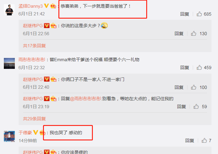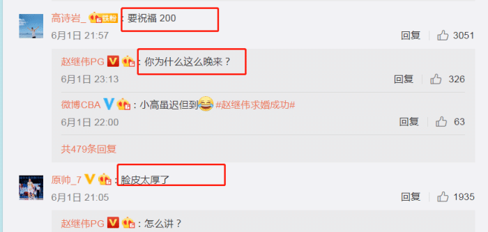 北京首钢队长翟晓川送上祝福,“哎哟,幸福哟”,赵继伟回应,“追赶你”。而原帅则给赵继伟留言,“脸皮太厚了”,赵继伟回应,“怎么讲”,一时之间,也让人摸不着头脑。