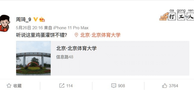 周琦则是在社交媒体上打卡,他不忘用鸡蛋灌饼的梗来自黑,周琦发了一个位置,同时配文:“听说这里鸡蛋灌饼不错?”