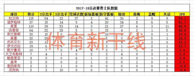 这个赛季是杜兰特加盟勇士的第一年,他们在总决赛战胜骑士,而杜兰特也凭借统治级的表现力压库里夺得了FMVP,如果用CBA的SPR值公式计算,杜兰特的SPR值达到了85.6,位列全队第一。库里则是67.4,位列全队第二。伊戈达拉29位列第三,汤普森27.5位列第四,追梦格林23.4位列第五。NBA的评选结果与CBA的SPR计算公式相吻合。