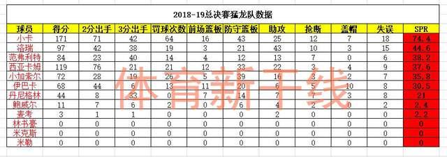 猛龙队在这一年以4-2的大比分战胜勇士夺冠,最终莱昂纳德夺得FMVP,他的SPR值达到74.4,排名第二的洛瑞只有44.6,两者差距较大,所以莱昂纳德的当选毫无争议。排名第三的是范弗利特,SPR值为38.2;西亚卡姆则以37.6位列第四,小加索尔35.8位列第五,NBA评选结果与CBA公式计算出来的一致。