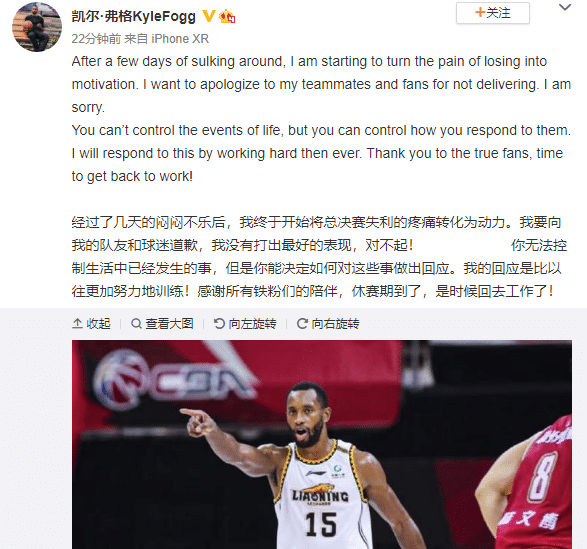 来源:直播车05-06 19:34直播车讯 5月6日,距离CBA总决赛已经过去5天的时间了,最终获得亚军的辽篮外援弗格在社交媒体上道歉,他表示: