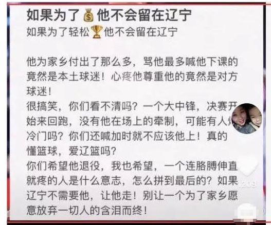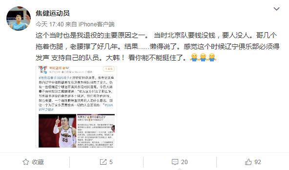这个当时也是我退役的主要原因之一。 当时北京队要钱没钱,要人没人。哥几个拖着伤腿,老腰撑了好几年。结果……懒得说了。辽宁男篮应该发表声明支持自己的球员,也希望韩德君能够顶住外界的压力,“感觉这个时候辽宁俱乐部必须得发声 支持自己的队员。大韩! 看你能不能挺住了。”