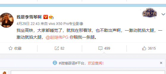 李雪琴在社交媒体上表示:我坐高铁,大家都睡觉了,就我在那看球,也不敢出声啊,一激动就掐大腿,一激动就掐大腿,@赵继伟PG 你赔我一条腿。