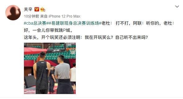 老杜:好,一会儿你带我跳P城。这年头,开个玩笑还必须注明:我在开玩笑么?自己听不出来吗?显然关辛是想告诉大家,杜锋关于易建联复出总决赛的言语只是玩笑话,不必当真。