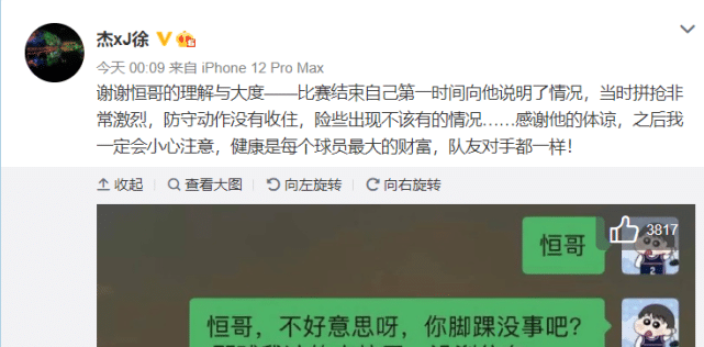 徐杰在社交媒体上写道:“谢谢恒哥的理解与大度——比赛结束自己第一时间向他说明了情况,当时拼抢非常激烈,防守动作没有收住,险些出现不该有的情况……感谢他的体谅,之后我一定会小心注意,健康是每个球员最大的财富,队友对手都一样! ”