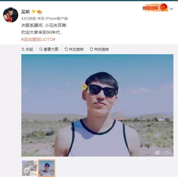 大概是得知当选为MVP的消息,心情大好的吴前在社媒晒出自己的帅照,耳旁还夹着小黄花,生活很是惬意。