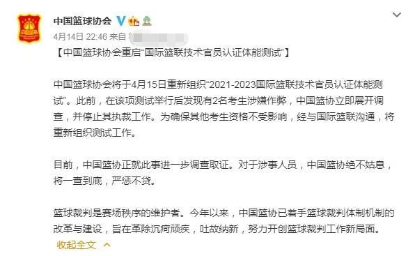 这两名裁判到底有没有作弊呢?4月15日,中国篮协的发文或许给出了答案。在发文中,篮协表示,将在4月15日重新组织进行2021-2023国际篮联技术官员认证体能测试”,这也间接证明了考试存在问题,对于重新考试,中国篮协表示,为了不让其他考生资格受到影响,经过与国际篮协沟通,测试将重新进行。