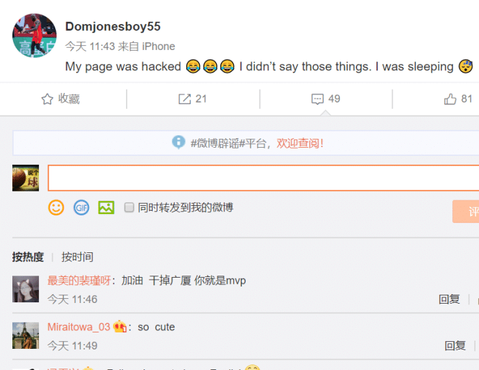 他先是发博表示看到MVP候选名单时让自己哭笑不得,并表示将专注季后赛。随后再次更新微博“我因为没打够39场比赛没法拿MVP,我打了37场啊,所以恭喜获奖者了,你拿个MVP只不过是个安慰奖罢了。”几分钟后删除再发一条“我号被盗了,我啥也没说,我当时在睡觉呢。”