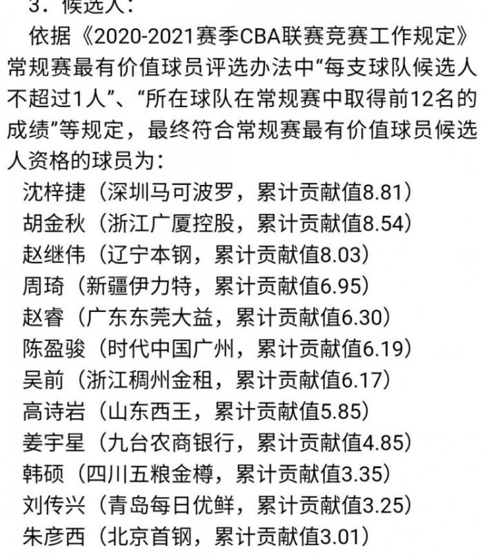 来源:直播车04-14 15:36直播车讯北京时间4月14日,CBA联赛官方给出了本赛季的常规赛MVP候选名单,作为国内最大的篮球职业联赛,CBA选出MVP的方式也是历史罕见。虽然我们都知道CBA这个赛季迎来了很多改革措施,只不过很少有人猜到选取一个常规赛MVP居然会有这么多限制条件。而且当这份榜单公布了之后,最让人意想不到的是辽宁队的赵继伟将有资格成为MVP,而作为队友的郭艾伦居然没有这个资格,这一消息也直接就冲上了微博的热搜。
