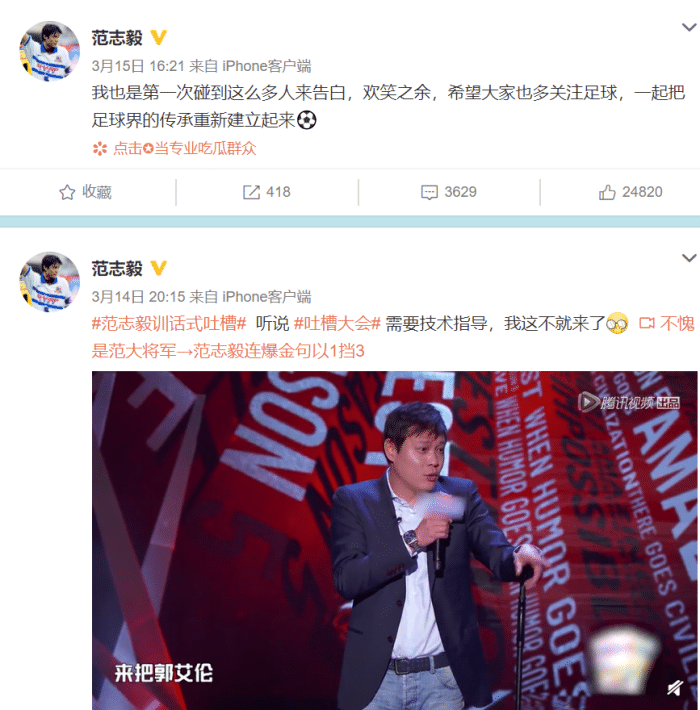 罗永浩也上过吐槽大会,他与范志毅的视频连线中,后者再次回应因为自己的吐槽导致引起舆论的事情“我不是骂人,我后来很后悔。说白了,都是面子上的事。因为很多时候自己也经历过,和原来这批老的男篮都有很深的交情。吐槽大会以后呢,就看似不是问题的问题吧,现在都当问题了,这就麻烦了。”