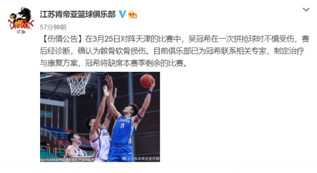 来源:直播车03-28 16:38直播车讯北京时间3月28日,来自江苏男篮官方社交媒体的消息,球队主力中锋吴冠希出现,赛季报销。江苏男篮官方写道:“对阵天津的比赛中,吴冠希在一次拼抢球时不慎受伤。赛后经诊断,确认为髌骨软骨损伤。目前俱乐部已为冠希联系相关专家,制定治疗与康复方案,冠希将缺席本赛季剩余的比赛。”