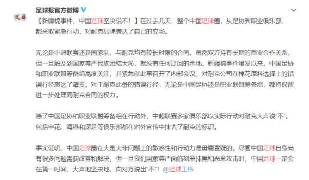 谴责,很熟悉的字眼,但是这还不是足协最让人失望的地方,作为第一个发声的团队,足协给其他人打了样,接下来包括篮协等手握耐克、阿迪达斯合同的团队大概率会借鉴这样的操作,而这样的处理方式,显然是耐克、阿迪达斯想看到的。