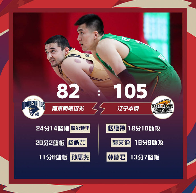 同曦82-105辽宁 赵继伟18+10 郭艾伦19+9 杨皓喆20分