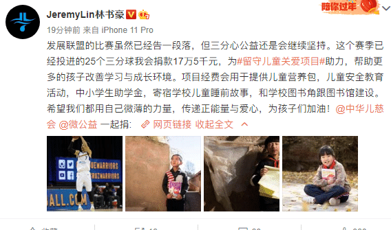 “发展联盟的比赛虽然已经告一段落,但三分心公益还是会继续坚持。这个赛季已经投进的25个三分球我会捐款17万5千元,为#留守儿童关爱项目#助力,帮助更多的孩子改善学习与成长环境。项目经费会用于提供儿童营养包,儿童安全教育活动,中小学生助学金,寄宿学校儿童睡前故事,和学校图书角跟图书馆建设。希望我们都用自己微薄的力量,传递正能量与爱心,为孩子们加油!”
