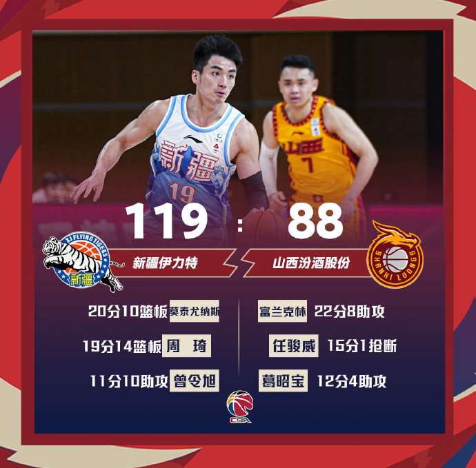 新疆119-88击败山西 周琦19+14 莫泰20+10 富兰克林22+8