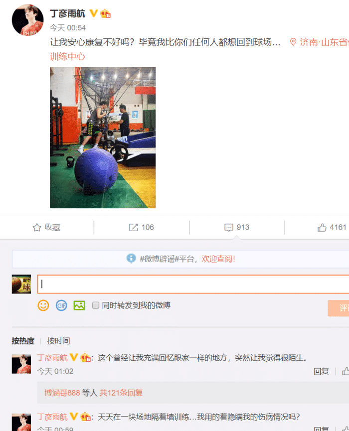可是让巩晓彬没有想到的是,在媒体报道不久后,丁彦雨航回怼了,这次小丁看起来火气也不小。丁彦雨航在自己的社交媒体上晒出了自己进行康复训练的照片,并配文道:让我安心康复不好吗?毕竟我比你们任何人都想回到球场。从小丁的定位来看,虽然他依旧没有和球队汇合,可是他已经回到了山东训练中心进行康复。