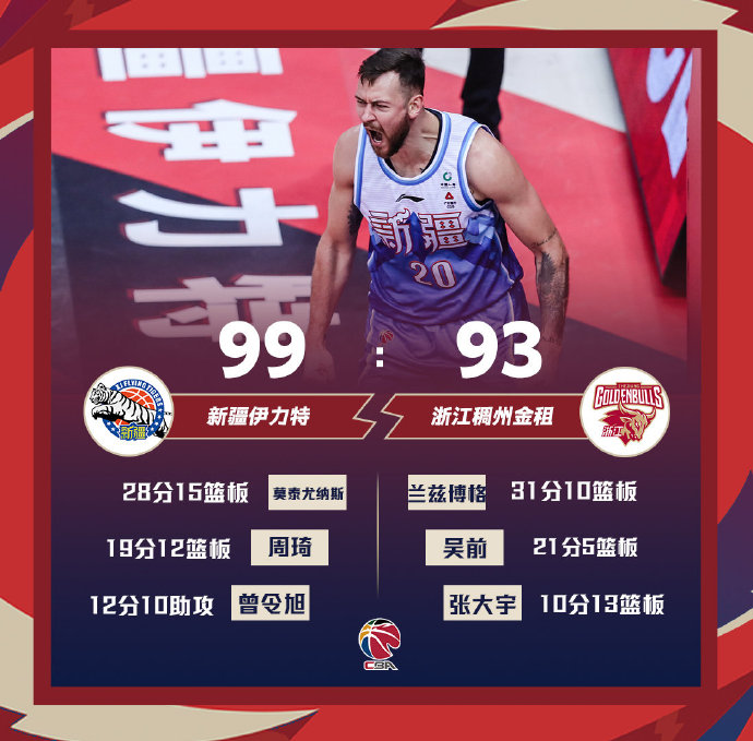 新疆(28-11):莫泰尤纳斯28分15板6助2断2帽、周琦19分12板、于德豪10分2板2助2断、唐才育12分3助2断、齐麟10分5助2断、曾令旭12分10助。