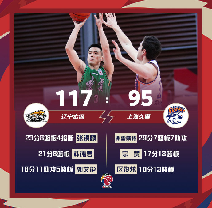 辽宁117-95轻取上海 郭艾伦18+5+11 张镇麟23+8