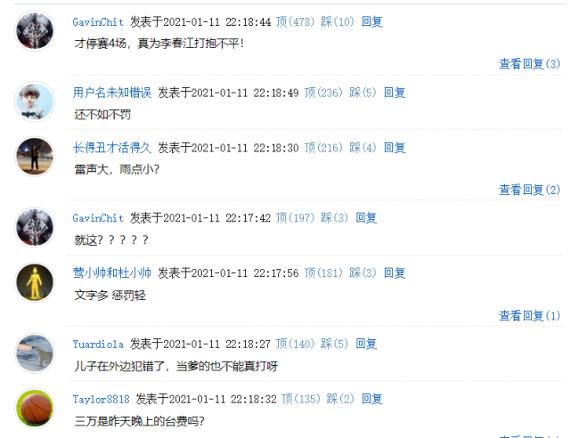球迷们纷纷表示:“才停赛4场,真为李春江打抱不平!”“文字多 惩罚轻”“雷声大,雨点小?”“可以,大闹技术台不禁赛!”“就这?”看来,这次CBA想息事宁人,又惹了众怒。