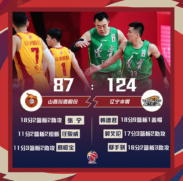 辽宁124-87大胜山西 韩德君18+9 郭艾伦17分