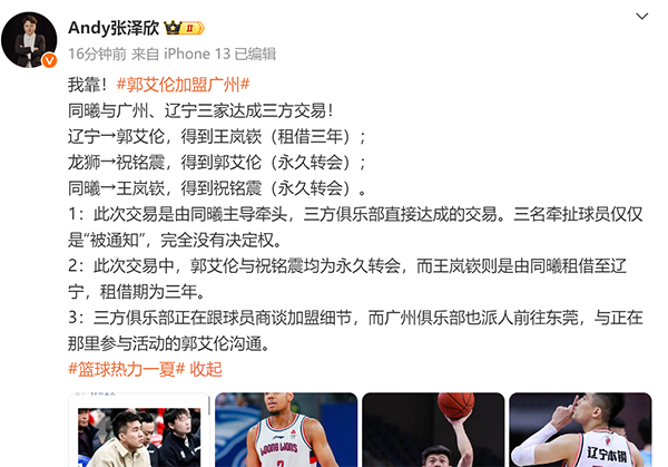 CBA 重磅交易!郭艾伦转投广州男篮,辽广同三方交易细节披露