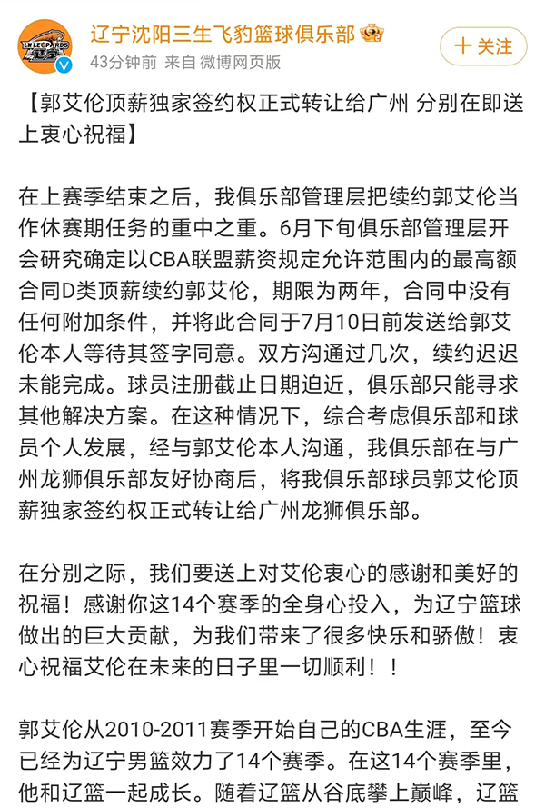 辽宁男篮强调,在发送合同后,双方沟通过几次,续约迟迟未能完成,鉴于球员注册截止日期迫近,俱乐部只能寻求其他的解决方案,经和郭艾伦本人沟通,我俱乐部和广州男篮友好协商,将郭艾伦签约权交易给了广州男篮。