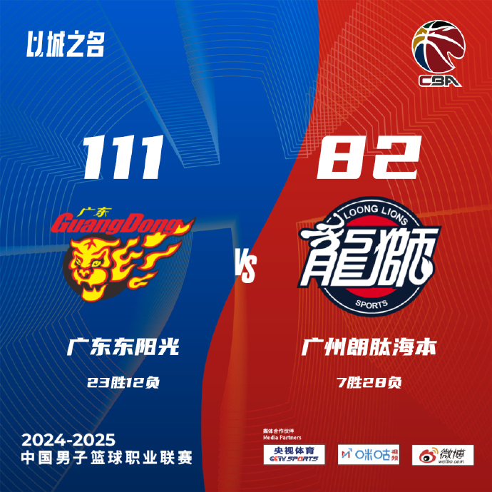 来源:直播车01-24 22:19 直播车讯:北京时间1月24日消息,2024-25赛季CBA常规赛进入第35轮角逐。坐镇主场的广东男篮经过四节较量以111-82战胜广州男篮,广州队吞下7连败。