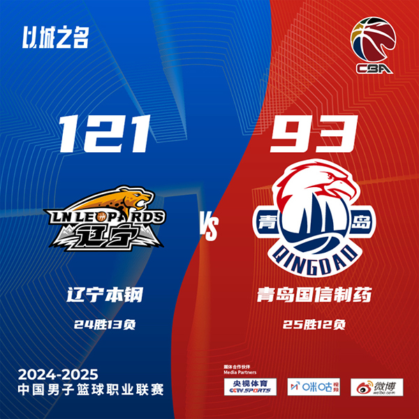末节,杨瀚森助攻王睿泽底线空切、段昂君外线空位三分球,将分差缩小。辽宁队加强防守,威尔斯反击连得4分,韩德君空切“吃饼”得到4分,青岛队外线连续三分球不中,张镇麟、赵继伟相继反击得手,威尔斯命中后撤步三分球,将领先优势一举扩大到20分以上,比赛早早失去胜负悬念。最终 ,辽宁队主场以121比93大胜青岛队,完成复仇。