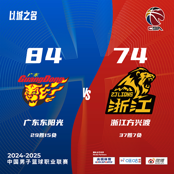 来源:直播车03-25 08:25 直播车讯:北京时间3月24日消息,2024-25赛季CBA常规赛继续第44轮角逐。坐镇主场的广东男篮经过四节较量以84-74战胜浙江广厦男篮,取得2连胜;广厦队6连胜终结。