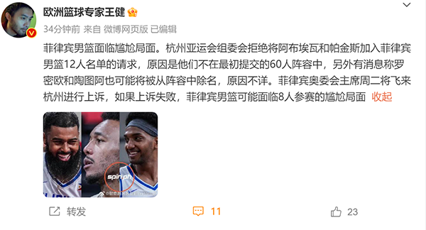 中国男篮利好!菲律宾队或8人出战亚运会,归化被拒,老将云集