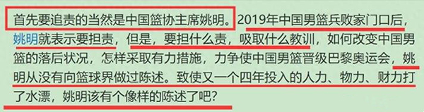 接下来,我们来说说姚明这边,在交出了男篮世界杯历史最差成绩后,姚明这边的处境是越来越困难,比如说近期,中国男篮名宿孙保生专门撰写了长文点评了男篮的失利。在文中,孙老建议对于男篮的情况进行追责,孙老认为首当其冲追责的人是姚明,孙老表示姚明上任后男篮连续两届无缘奥运会,姚明表示要担责,可是要担什么责?却始终没有答案。孙老人为这件事情上,姚明应该给个说法,毕竟八年的人力物力财力打了水漂。