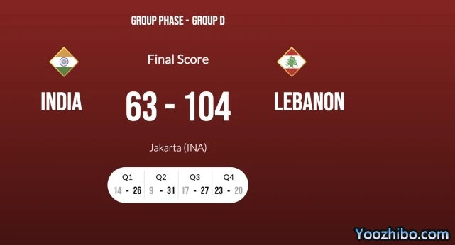 直播车讯:北京时间7月17日讯 男篮亚洲杯小组赛继续进行,印度男篮对阵黎巴嫩男篮,最终,印度队63-104、41分惨败给了黎巴嫩队,第二节单节印度队更是9-31,又是一场惨案,印度队遭遇了3连败,这三场合计输了136分。