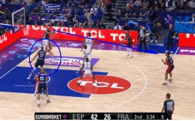 距离上半场还剩3分23秒时, 戈贝尔在内线出现机会,他举手示意队友传给自己,站在底线的亚布塞莱犹豫了一下,没传给他,而是传给弧顶的队友。这时候,戈贝尔再次要球,弧顶的队友迟疑了下,终于把球传向他。不过,西班牙这时候补防到位,抢断了传球。