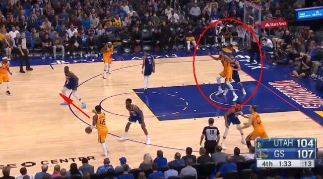 这一幕让人很容易联想到上赛季爵士对勇士的一场比赛。当时,戈贝尔在内线出现错位单打的机会,他的身后是明显比他矮的克莱-汤普森。他向米切尔招手要球,而米切尔犹豫了下,并没有传给他。戈贝尔怕3秒违例,扭头走出了禁区。