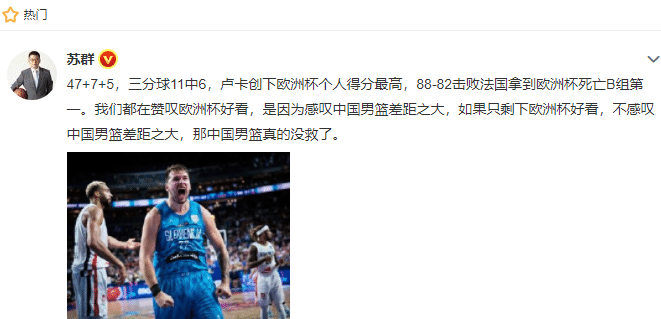躺枪!欧洲杯星光闪耀,东契奇狂轰47分,苏群:中国男篮差距太大