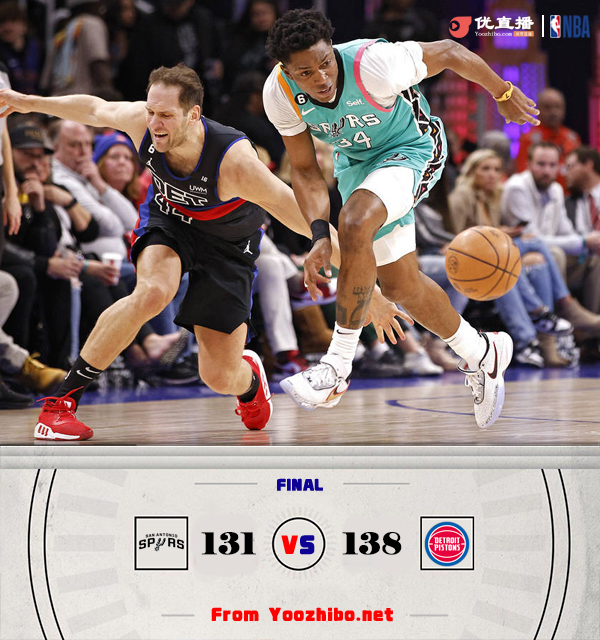 直播车2月11日讯 活塞今日坐镇主场迎战马刺,两支球队本赛季状态都很糟糕,活塞目前3连败排在东部倒数第一,而马刺则吃到10连败排在西部倒数第二。首节对决马刺客场作战但状态更优,节中一波12-5的攻势帮助他们占据上风并在末段一度拉开至两位数领先;次节马刺连续打三分得手分差一度拉大至半场最大的16分,不过活塞在这之后迎来反弹,他们突然找回手感回敬一波25-9的攻势一举抹平比分,马刺靠着科林斯最后的进球才重新取得1分领先进入下半场。休息归来活塞和马刺短暂拉锯中再度占据上风,他们不断冲击篮下送出12-2的攻势一举拉开比分;随后的马刺虽然被动但迎来奇兵,格拉汉姆最后时刻连续飙进三分帮助球队扳平比分比赛也被拖入加时。双方激战了两个加时才分出胜负,活塞最后时刻抓住机会送出7-0的攻势为球队收下比赛。最终,活塞双加时力克马刺并送后者11连败。