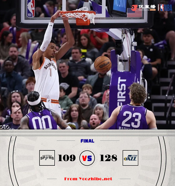 直播车2月26日讯 NBA常规赛,爵士主场迎战马刺。爵士近期遭遇5连败,排在西部倒数第五,马刺3连败继续西部垫底。一开场,双方短暂相持,随后爵士持续发力打出17-5的进攻高潮一举取得两位数优势,次节马刺依旧没有起色,爵士内外开花将分差拉开到20分以上,半场战罢爵士63-39领先。下半场,两队展开对攻,分差依旧维持在20分左右,末节马刺一波8-0续命,但此后爵士内外开花重新拉开分差,马刺大势已去无力回天。最终,爵士128-109轻取马刺,结束5连败的同时送给对手4连败。