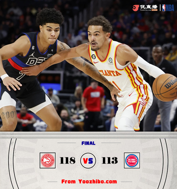 直播车讯10月27日讯 NBA常规赛老鹰对阵活塞,老鹰上场比赛不敌黄蜂遭遇赛季首败,活塞则是最近遭遇3连败。上半场老鹰靠着亨特和特雷-杨两人的发挥取得领先,康宁汉姆状态不错联手博格达诺维奇努力追分,第二节老鹰手感有所下降,活塞在康宁汉姆的带领下迫近比分,上半场老鹰只领先1分。下半场回来活塞一度完成反超,但老鹰及时调整在特雷-杨的带领下夺回领先,最终老鹰118-113力克活塞。