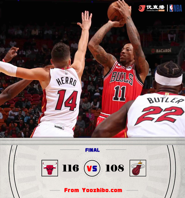 直播车10月20日讯 热火今日坐镇主场迎战自己新赛季的首个对手公牛,热火方面除了受困肌腱炎的奥拉迪波外核心阵容基本全员可以出战;公牛这边则连续遭到打击,除了鲍尔以外,拉文因为膝盖问题也缺席了本场比赛。热火在面对阵容不整的公牛只打了一节好球,公牛虽然缺少了拉文和鲍尔等核心主力,但以德拉季奇和道苏姆为首的他们在第二节轰进7记三分改写开局不利局面。下半场成为德罗赞的表演时间,第三节他疯狂砍下19分,第四节也有9分入账帮助公牛守住胜利。最终,公牛客场扑灭热火迎来开门红。