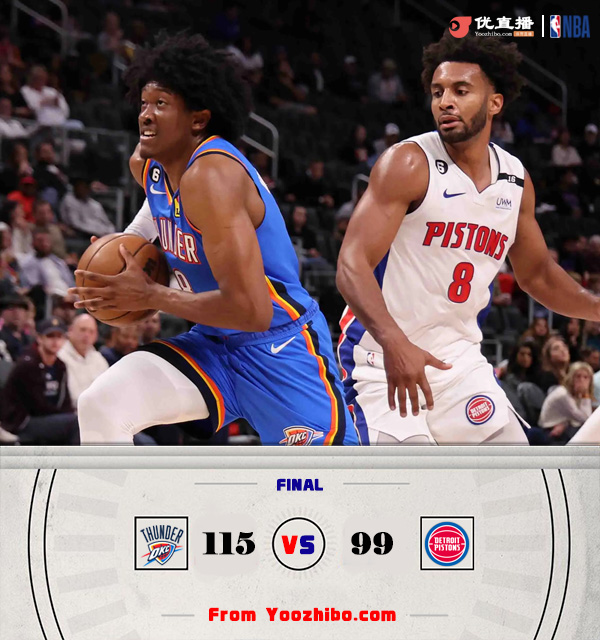 直播车 10月12日讯 NBA季前赛今日继续,活塞迎战雷霆。两队新赛季都将继续以锻炼新人为主。一开场,雷霆连中三分,活塞内外开花给出回应。巴格利伤退,活塞三分4连击领先4分结束首节。次节上来,双方依旧打得难解难分,比分交替领先,双方互送进攻高潮,活塞半场结束时57-54领先3分。易边再战,雷霆连续打出进攻高潮取得两位数优势,活塞顽强追赶,三节打完雷霆反超8分。第四节,雷霆持续发力将分差拉开到20分,活塞大势已去无力回天。最终,雷霆115-99击败活塞,取得胜利。