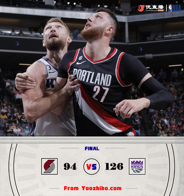 直播车10月10日讯 NBA季前赛继续进行,开拓者客场挑战国王,比赛开始后两队早早进入状态,福克斯外线对飚西蒙斯,中段开拓者进攻断电,许尔特连中三分率队打出12-2攻击波,末段开拓者进攻再次停滞,萨博尼斯予取予求率队再次打出9-0小高潮,首节结束后国王确立12分优势,次节回来,开拓者找回进攻状态,两队你来我往火热对攻,努尔基奇联手西蒙斯不断追分,但国王多点开花总能及时回应,半场战罢,国王已经领先17分。易边再战后国王延续进攻火力,莱尔斯和蒙克轮番冲击,国王再度打出13-3攻击波,三节结束后国王将分差扩大到21分,末节上来,两队接连换上替补阵容,比赛提前失去悬念,最终国王126-94大胜开拓者。