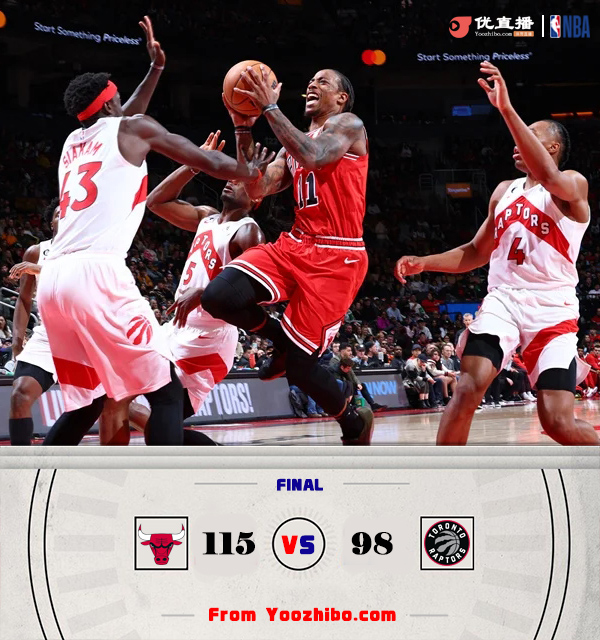 直播车讯 10月10日讯 NBA季前赛继续进行,猛龙主场迎战公牛,季前赛猛龙目前2胜1负,公牛则是1胜1负,双方全主力出战。开局猛龙就迅速进入比赛状态,范弗里特联手特伦特有内有外帮助猛龙迅速拉开比分,公牛则是靠德罗赞支撑起进攻,首节猛龙领先到双位数,次节猛龙替补也是保持不错的手感稳住优势,但双方命中率都有下降,德罗赞一度帮助公牛追到差5分,但猛龙众将依靠冲击力造杀伤稳住10分领先。第三节,德罗赞继续稳定发挥,拉文外线也连续发炮,两人联手带领公牛打出两波攻击波一举反超比分,但猛龙也顶住压力回应上咬住比分,依靠埃尔南戈麦斯的三分还保持领先,末节双方换上替补练兵,公牛依靠不错的外线手感重新夺回领先,而猛龙则是陷入得分荒,公牛抓住机会拉开双位数分差,最终公牛115-98逆转猛龙。